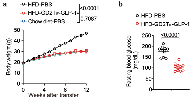 图1.单次输入GD2TIF-GLP-1细胞实现高脂饲料喂养小鼠体重和血糖的长期控制