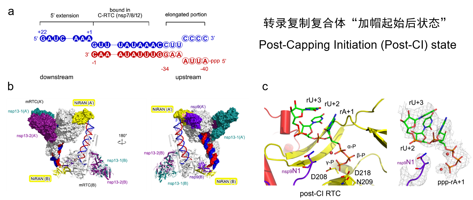 图4. (a)组装加帽起始后状态复合体所使用的RNA骨架。(b)加帽起始后状态复合体全貌。(c)加帽起始后状态复合体中RNA产物链5’三磷酸集团与nsp9蛋白共同定位与NiRAN结构域催化中心。