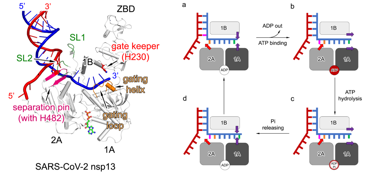 图3. 左图,新冠病毒解旋酶的关键结构单元。右图,ATP水解驱动的双链RNA解旋模式图。