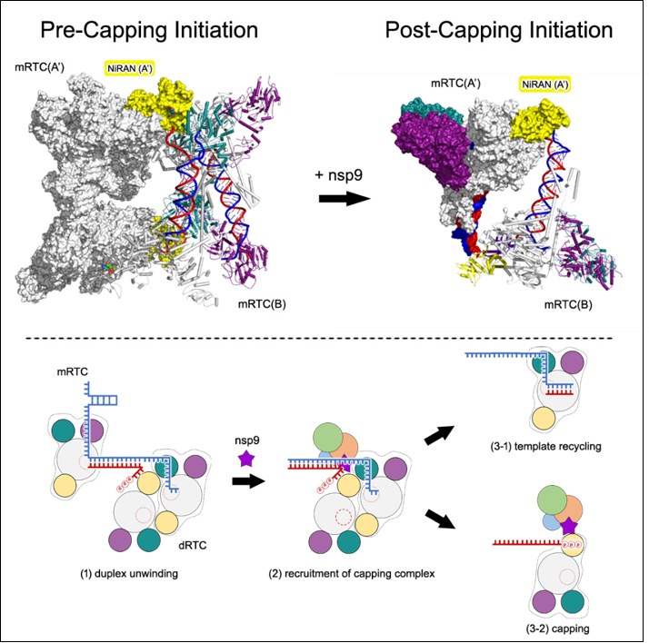 围绕冠状病毒转录复制过程,研究团队在过去5年中先后阐明了“核心转录复制复合体”(C-RTC)[1]、“延伸复合体”(E-RTC)[2]、“加帽中间态复合体”[3, 4]和“Cap0加帽复合体”[5]的工作机制。在这些工作的基础上,研究团队设计了多种全新核酸骨架,成功捕捉到转录复制复合体“加帽起始前状态”(Pre-Capping Initiation, Pre-CI)和“加帽起始后状态”(Post-Capping Initiation, Post-CI)两个超级复合体,阐明了RNA模板循环和RNA加帽起始过程协同发生的分子机制(图1)。
