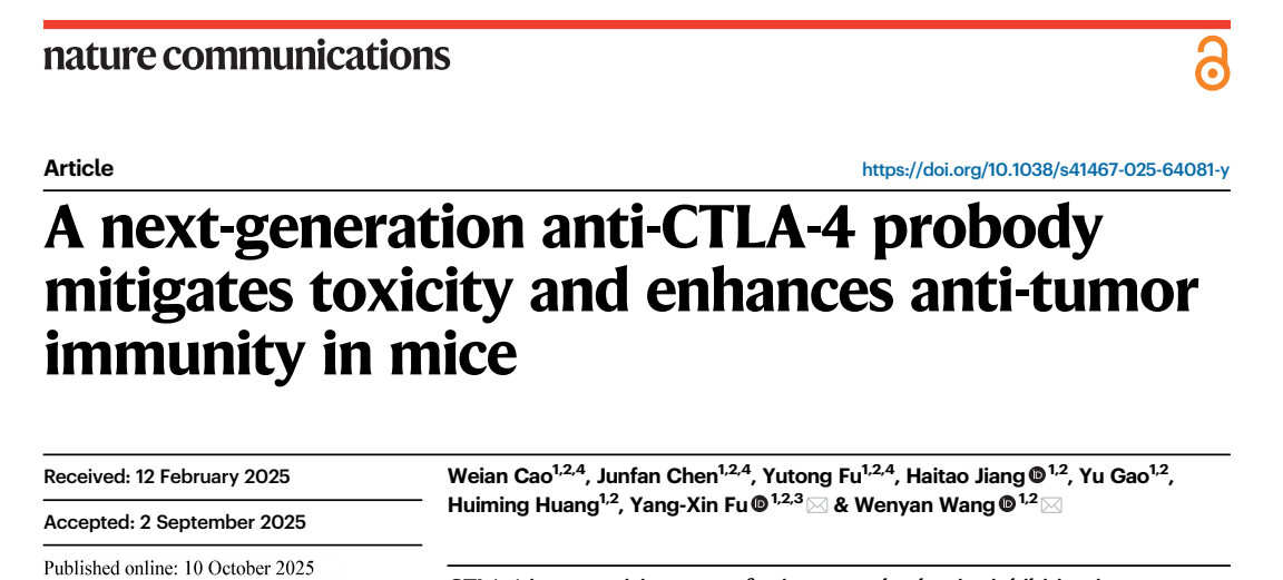 2025年10月10日,清华大学基础医学院傅阳心/王文彦团队在Nature Communications上在线发表题为“A next-generation anti-CTLA-4 probody mitigates toxicity and enhances anti-tumor immunity in mice”的研究论文。该研究通过基于可被肿瘤相关蛋白酶切割的方式折叠抗体的抗原结合片段,构建出新一代的CTLA-4 抗体的前药,命名为ProCTLA-4。在临床前小鼠模型中,该抗体能有效清除肿瘤微环境中的抑制性Treg,增强肿瘤相关抗原特异性的CD8+ T细胞应答,同时与当前CTLA-4抗体治疗药物相比表现出更低的毒性。此外,与目前 CTLA-4 前药抗体(BMS-986288)相比,ProCTLA-4 在“冷”肿瘤(如黑色素瘤)疗效效果方面具有更大优势。该前药设计为抗体药物确立了一种全新的范式,能在提高治疗效果的同时有效限制irAE发生。