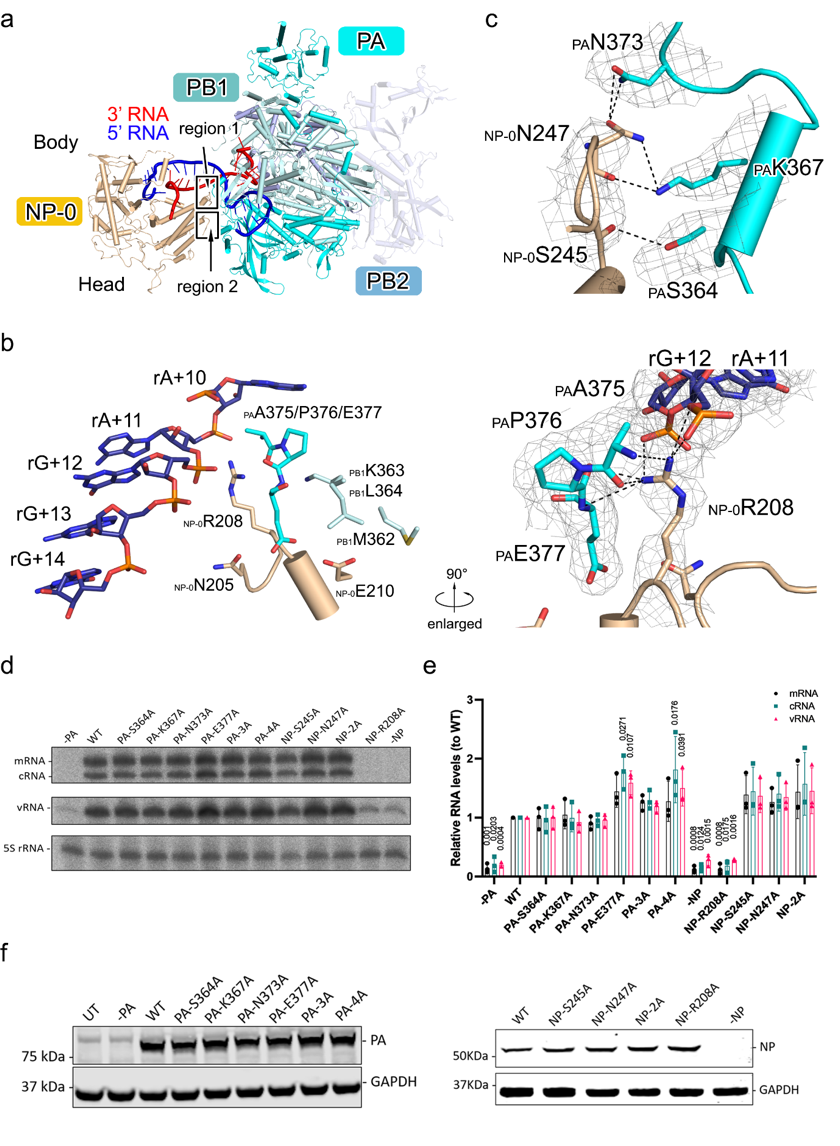 更为重要的是,研究揭示了一个特殊的核蛋白亚基——NP-0。它位于聚合酶邻近的位置,与其他NP相比表现出独特的RNA结合形式。研究发现,NP-0通过其D72-K90区域插入RNA双链的分叉处,将双链RNA劈开为单链,并将其稳定地固定在自身的RNA结合槽中。这一构象不仅保护了RNA的末端结构,防止其降解,同时也为RNP环状结构的稳定性提供了支撑。与此同时,NP-0通过关键残基R208,S245,N247与聚合酶PA亚基和RNA之间形成复杂的相互作用网络。为了确定这些相互作用在病毒复制过程中的作用。研究人员们分别突变了NP和PA亚基上参与相互作用的氨基酸并通过复制子体系测定了突变体的转录复制活性,结果表明NP-0中的R208对于病毒的转录复制活性至关重要。