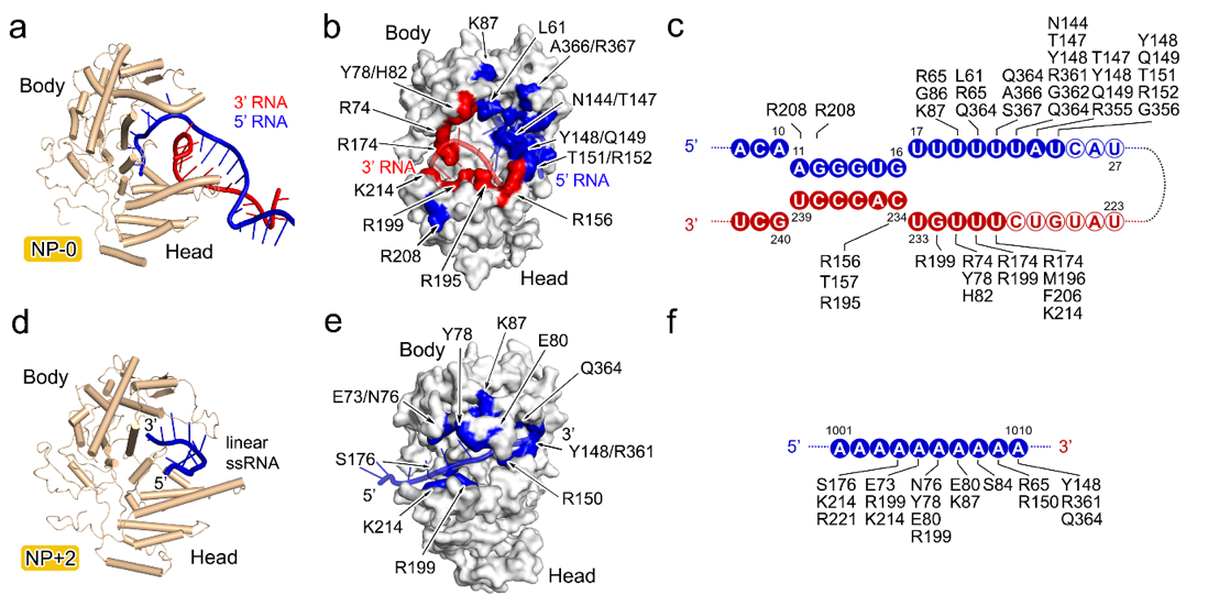 此外,研究团队还对比了NP-0与其他常规位置NP的RNA结合方式,揭示了两种模式的差异。在NP-0中,RNA以分叉的形式结合,表现出独特的双链劈开与稳定功能;而在其他位置的NP中,RNA以线性片段结合,每个NP大约容纳10个核苷酸,多个NP的结合槽首尾相连,形成一条连续的RNA保护路径。这一连续排列不仅牢固地包裹了病毒RNA,也最大限度地避免了外源核酸酶的攻击。。值得注意的是,许多被证实对病毒增殖至关重要的氨基酸残基,正好分布在这些RNA结合槽之中,这为开发靶向NP-RNA结合界面的新型抗流感药物提供了重要启示。
