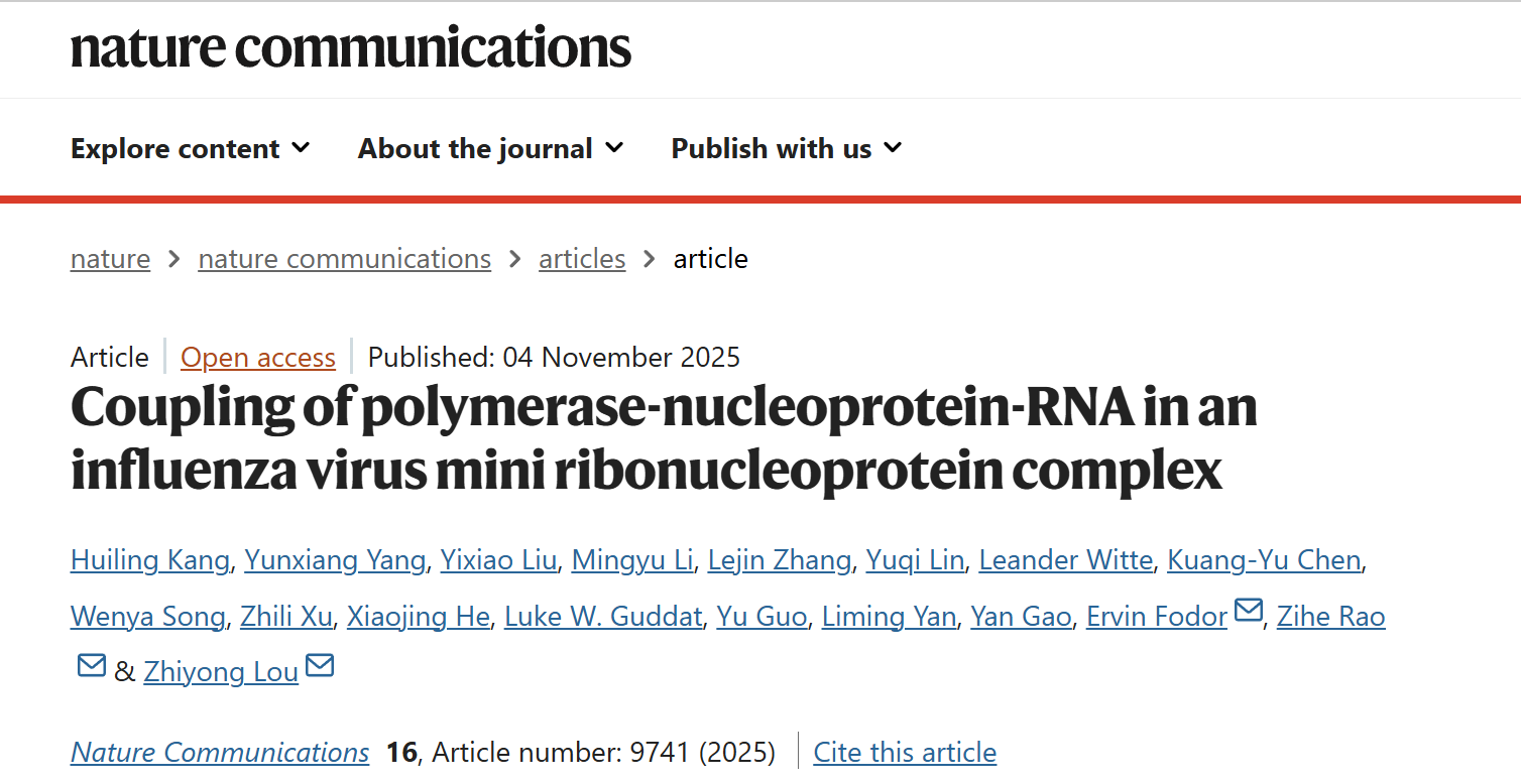 2025年11月4日,清华大学基础医学院娄智勇教授、饶子和院士团队联合英国牛津大学Ervin Fodor教授团队,在《Nature Communications》发表了题为 “Coupling of polymerase-nucleoprotein-RNA in an influenza virus mini ribonucleoprotein complex” 的研究论文。研究团队利用冷冻电镜单颗粒技术,在近原子分辨率下成功解析了mini-vRNP的结构,首次揭示了聚合酶、核蛋白和RNA三者之间的精细耦合方式,并捕捉到RNP在不同功能状态下的构象变化。这一成果不仅回答了多年来未解的核心科学问题,还为未来开发抗流感新策略提供了潜在靶点。