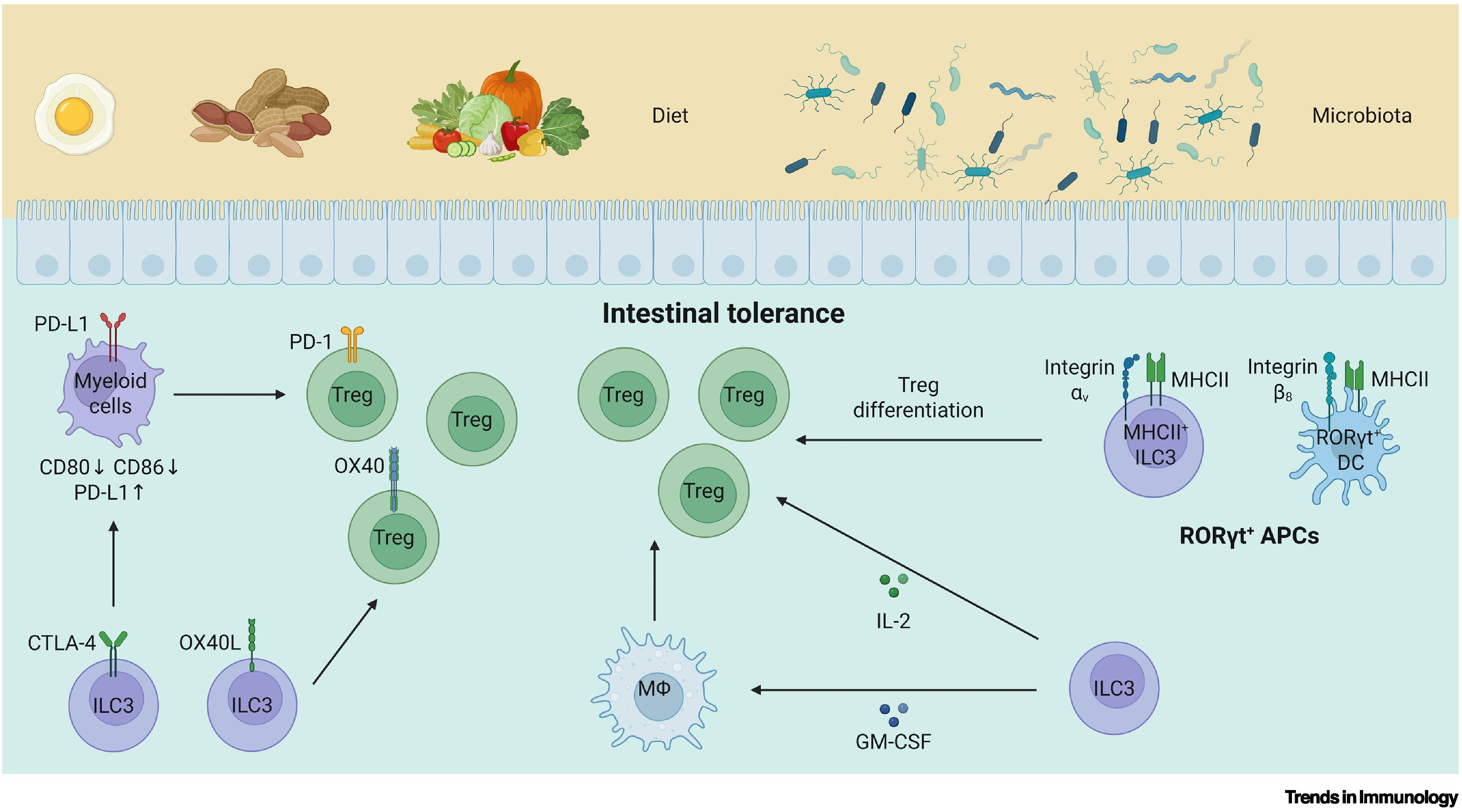 ILC3s在调控肠道免疫耐受方面,同样发挥着复杂而精密的调节作用。肠道是人和小鼠消化吸收食物的主要器官,有大量的微生物定植于此。肠道长期暴露于大量的食物抗原和微生物抗原之下,是机体重要的免疫器官。在建立对食物抗原和微生物抗原的免疫耐受过程中,ILC3s发挥着关键作用。一方面,ILC3s表面的各类共刺激分子可以直接通过细胞间相互作用调控T细胞的功能;另一方面,ILC3s可以通过诱导调节性T细胞(Treg)促进肠道免疫耐受。通过产生GM-CSF和IL-2等细胞因子,ILC3可以调节Treg的扩增与稳态,这对于维持肠道免疫耐受至关重要。