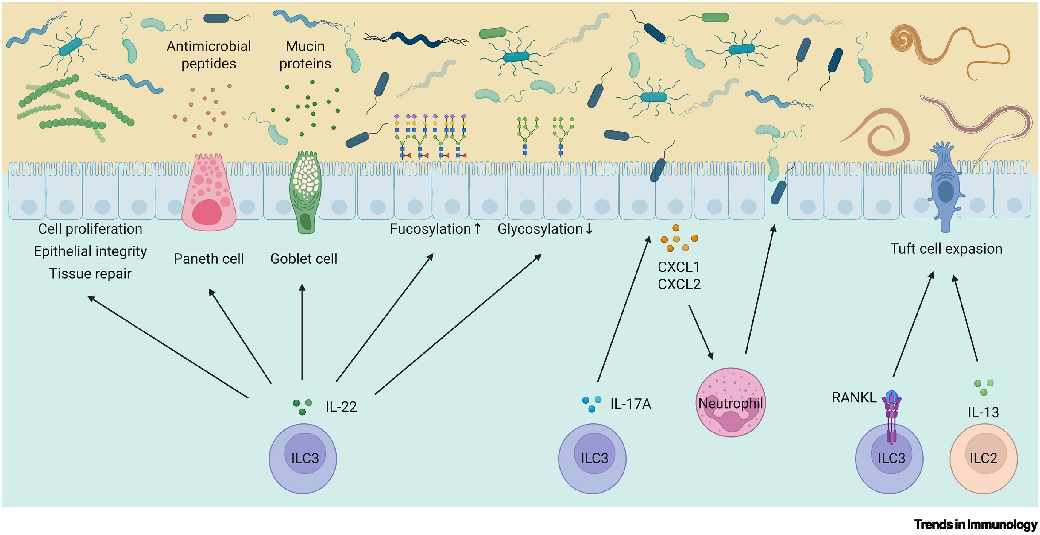 ILC3s不仅是众多肠道组织(肠系膜淋巴结、派氏小结和孤立淋巴滤泡等)发育所必需的细胞,更通过细胞因子分泌、抗原呈递和细胞间接触等多种方式,广泛参与上皮屏障维护。在维护上皮屏障过程中,ILC3s来源的IL-22发挥了至关重要的作用。IL-22能够直接作用于上皮细胞,调控干细胞的增殖与分化,维持上皮完整性并促进上皮修复。IL-22既可以刺激潘氏细胞分泌抗菌肽,也可以刺激杯状细胞分泌粘液素,抗菌肽和粘液素可以帮助机体抵御有害微生物对肠道的破坏。ILC3s通过IL-22依赖的方式精细调控肠道上皮细胞的糖基化修饰,如岩藻糖基化和半乳糖基化,从而重新塑造肠道菌群生态并影响宿主对病原体的易感性。此外,ILC3s可以通过IL-17A刺激肠上皮产生趋化因子CXCL1、CXCL2招募中性粒细胞,进而清除入侵肠道的有害微生物。ILC3s表达的RANKL还可促进由ILC2–簇细胞介导的抗寄生虫免疫反应。