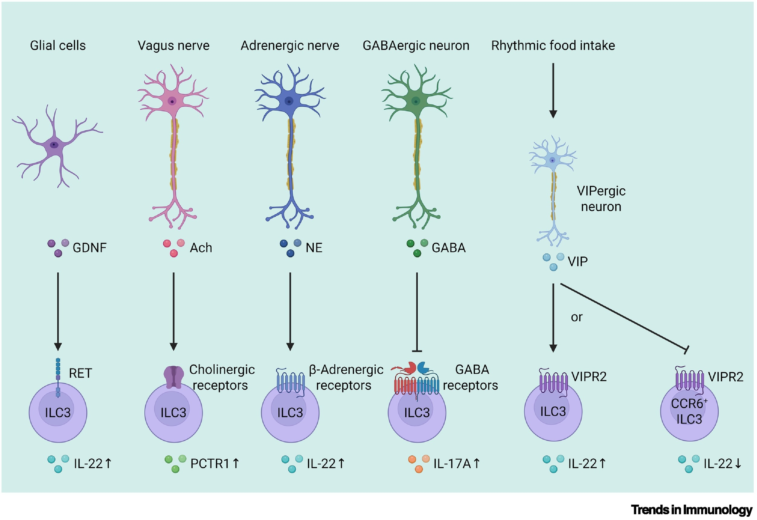 近年来,有大量研究聚焦于免疫系统与神经系统之间的相互作用,ILC3s同样可受神经系统的调节。肠道中的ILC3s表达多种神经信号受体,能够迅速响应肠道神经元的刺激。例如,神经胶质细胞可以分泌胶质细胞源性神经营养因子(GDNF),促进ILC3s分泌IL-22;迷走神经可以分泌乙酰胆碱(Ach),促进ILC3s分泌组织再生相关保护素1(PCTR1);交感神经可以分泌去甲肾上腺素,促进ILC3s分泌IL-22。ILC3s与神经系统之间的密切关系进一步揭示了其在肠道免疫中的核心作用。