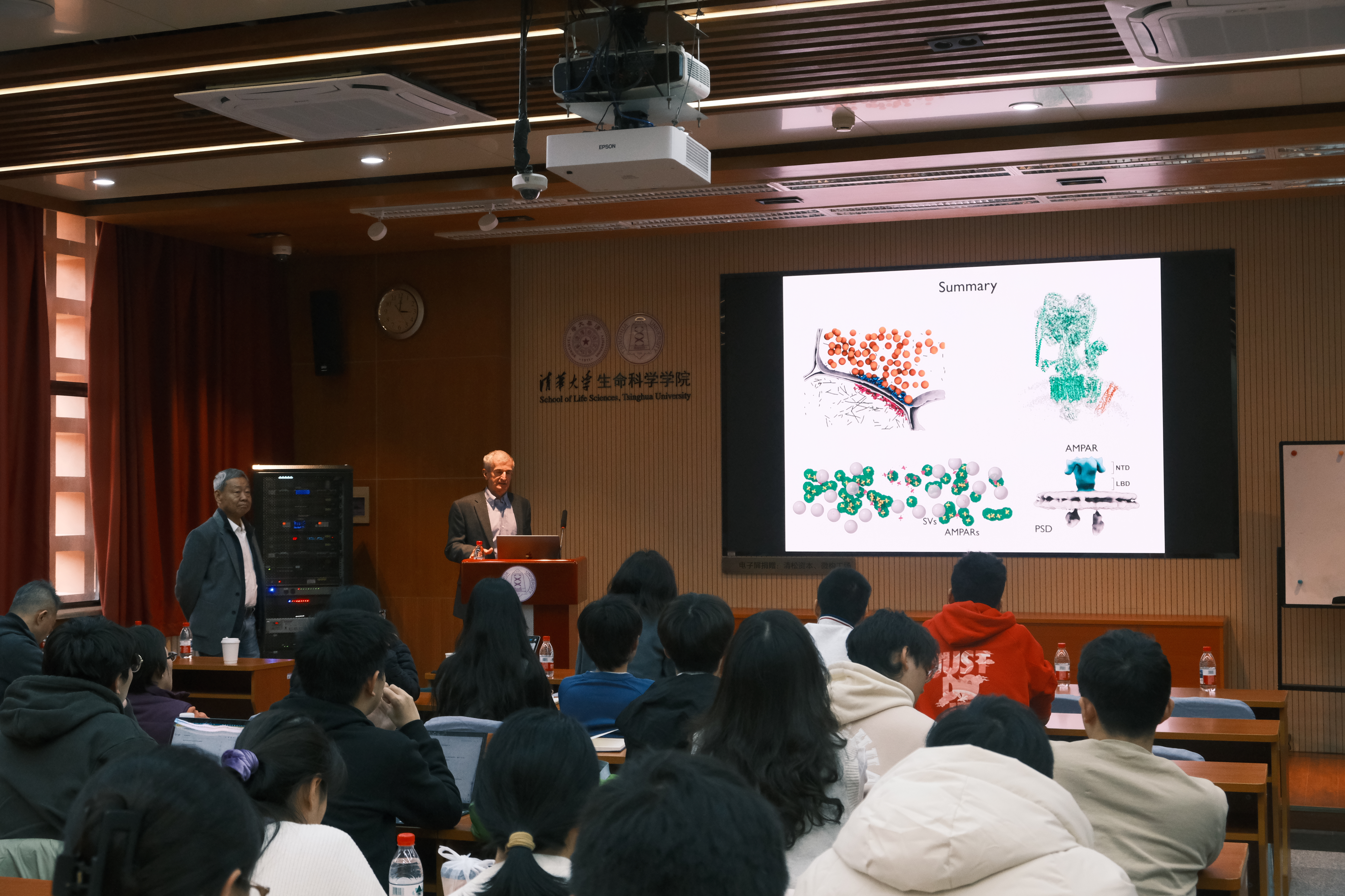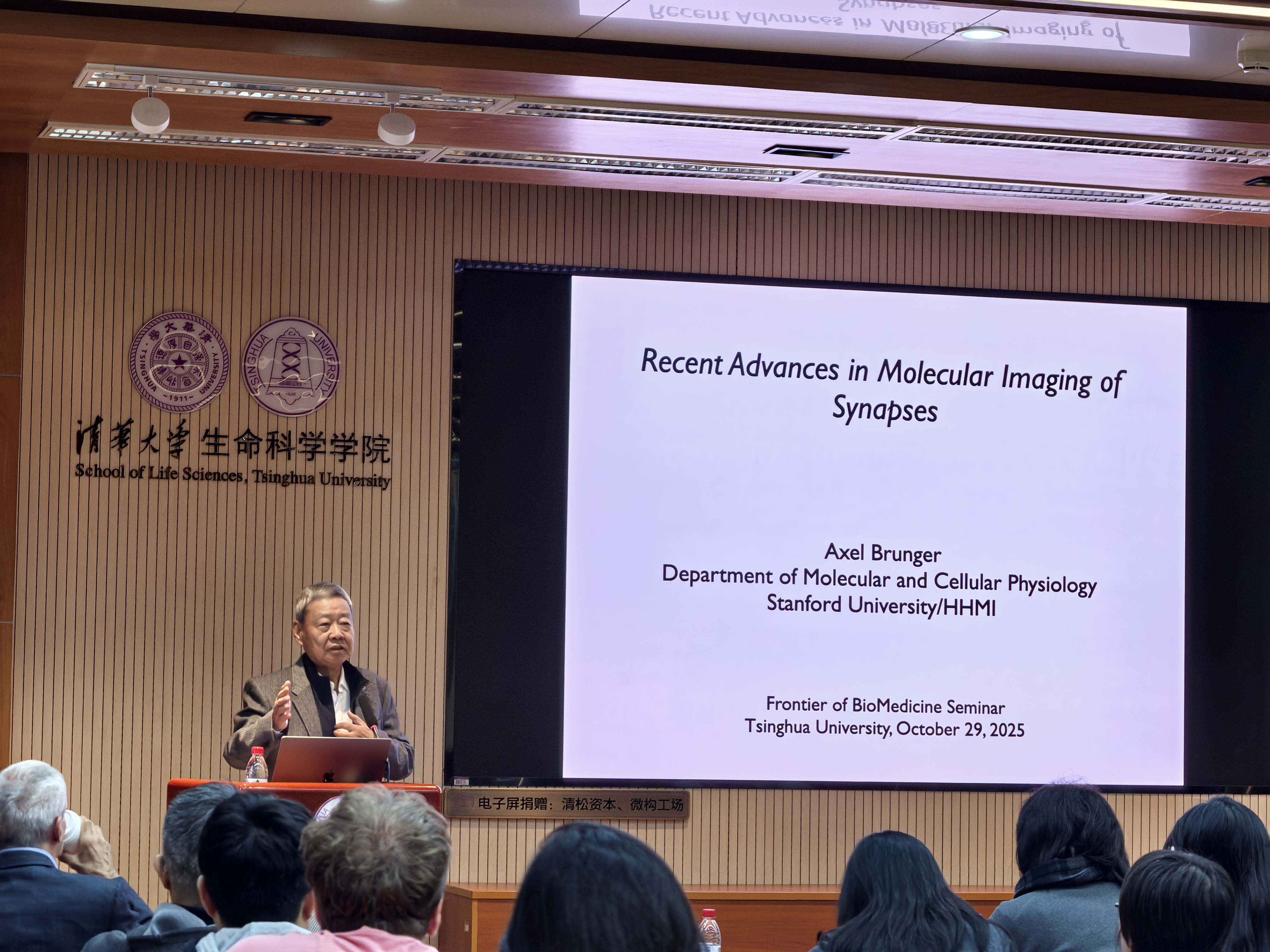 2025年10月29日,美国科学院院士Axel Brunger教授应清华大学基础医学院饶子和院士邀请做客本年度第12期生物医学前沿系列讲座(Frontier of Biomedical Seminar),进行了题为“Recent advances in molecular imaging of synapses”的学术报告。本期报告由饶子和院士主持。