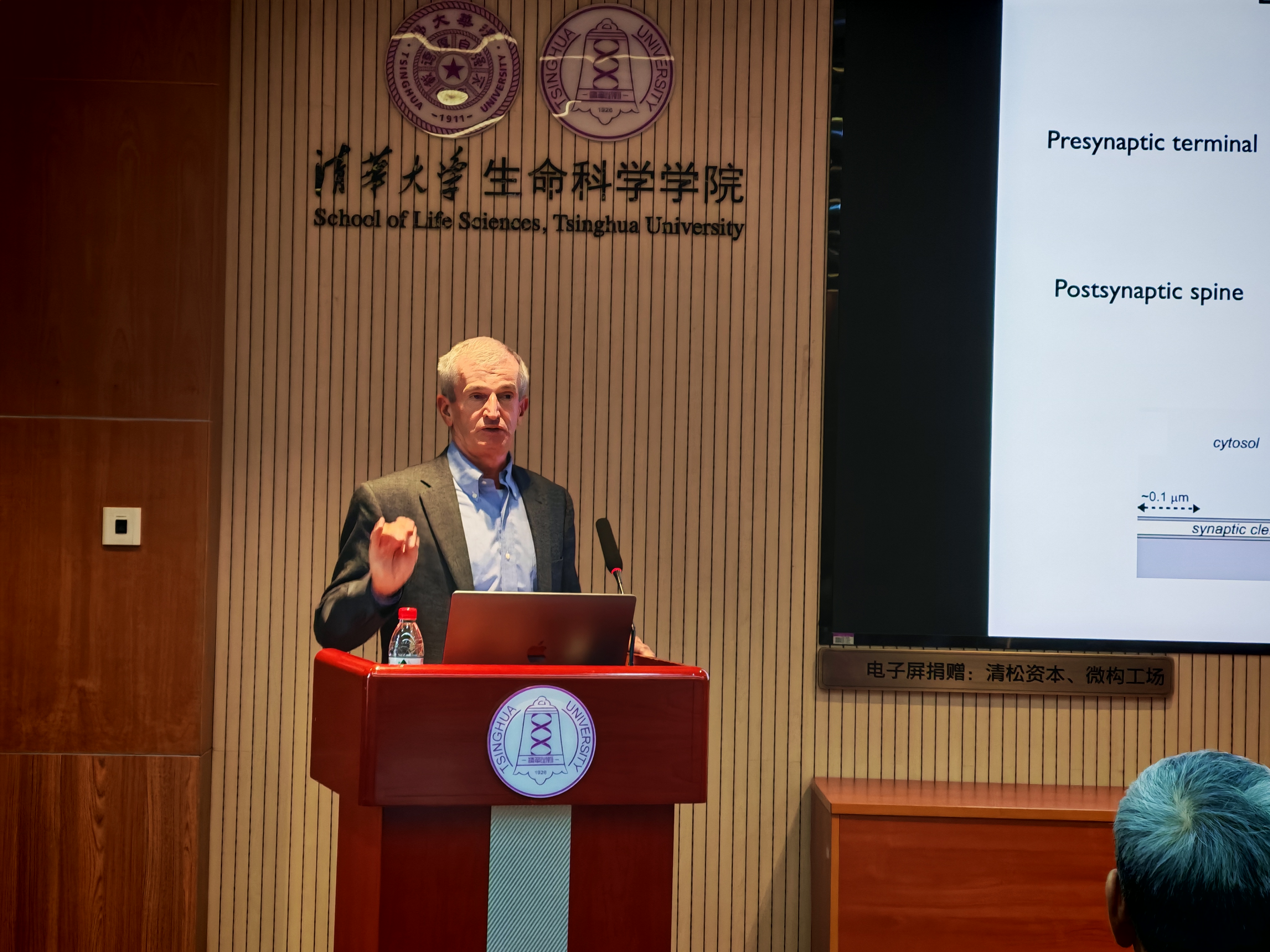 这场讲座让我期待已久,Brunger教授的名字在结构生物学领域如雷贯耳,他们最近的研究正在促进结构生物学从静态观察走向动态机制解析。Brunger教授团队最近的工作是通过冷冻电镜断层扫描实现突触囊泡的纳米级定位,并巧妙结合基因编辑,不仅结束了“纳米柱”模型等长期争议,更直接捕捉到蛋白质机器在神经递质释放中的精妙协作。最启发我的是他们“技术驱动理论突破”的研究思路--用原位结构生物学方法,在近生理状态下看到了突触后致密区存在的结构化网络。